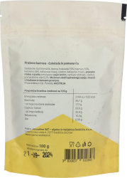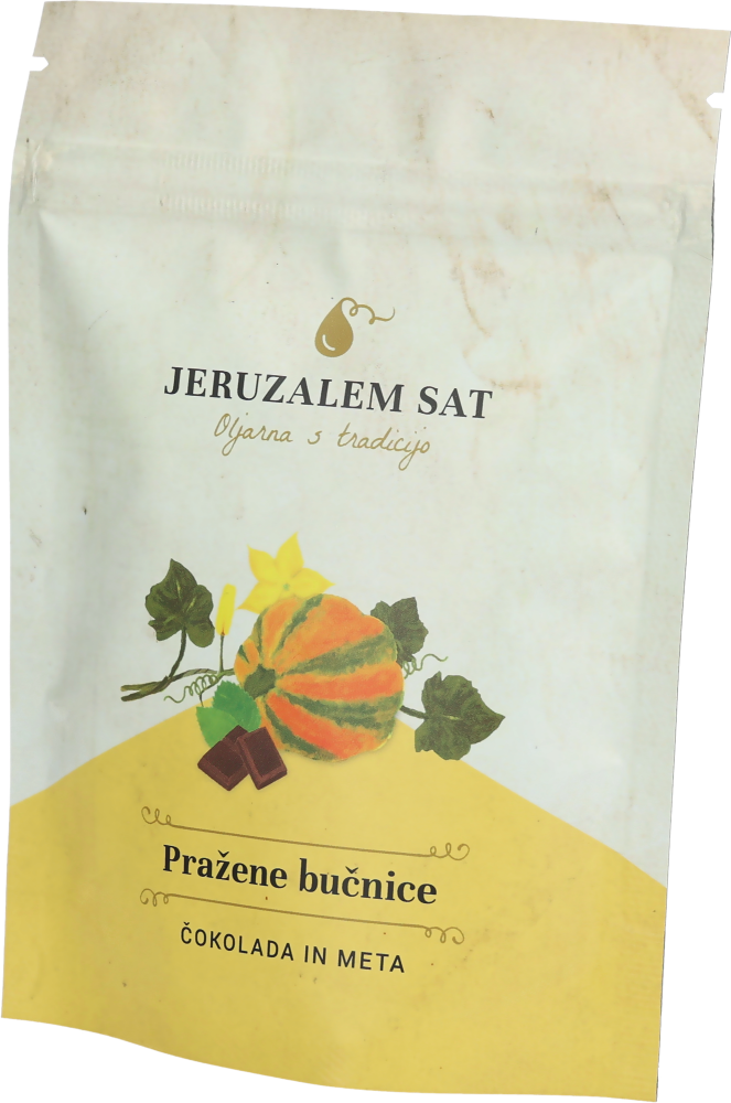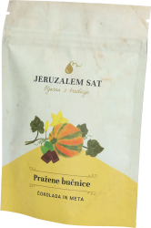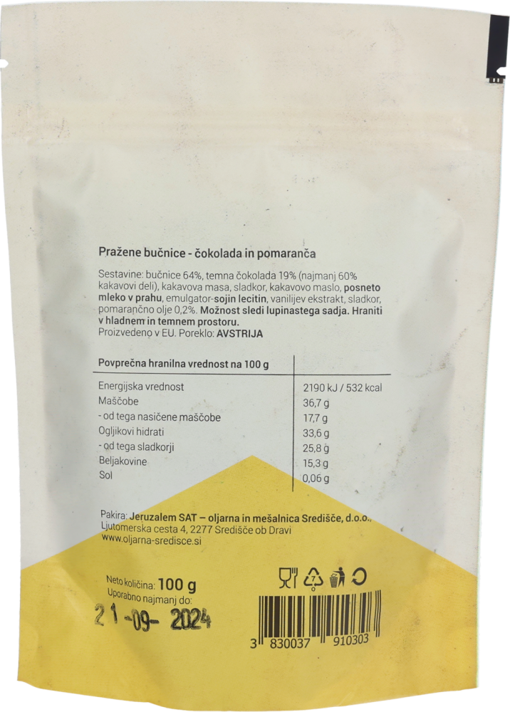 Zutaten: Kürbiskerne 64 %, dunkle Schokolade 19 %, mindestens 60 % Kakaoanteil, Kakaomasse, Zucker